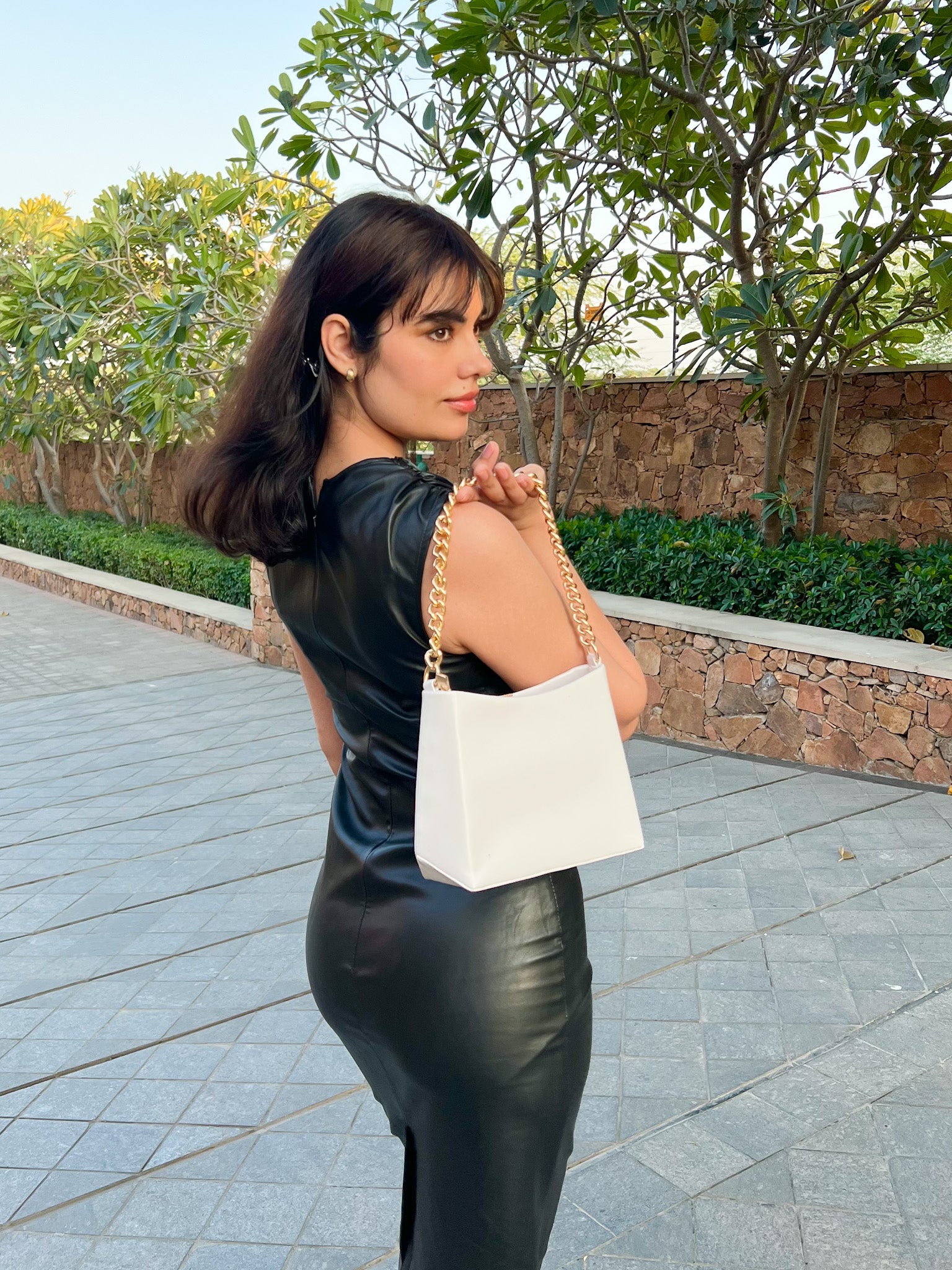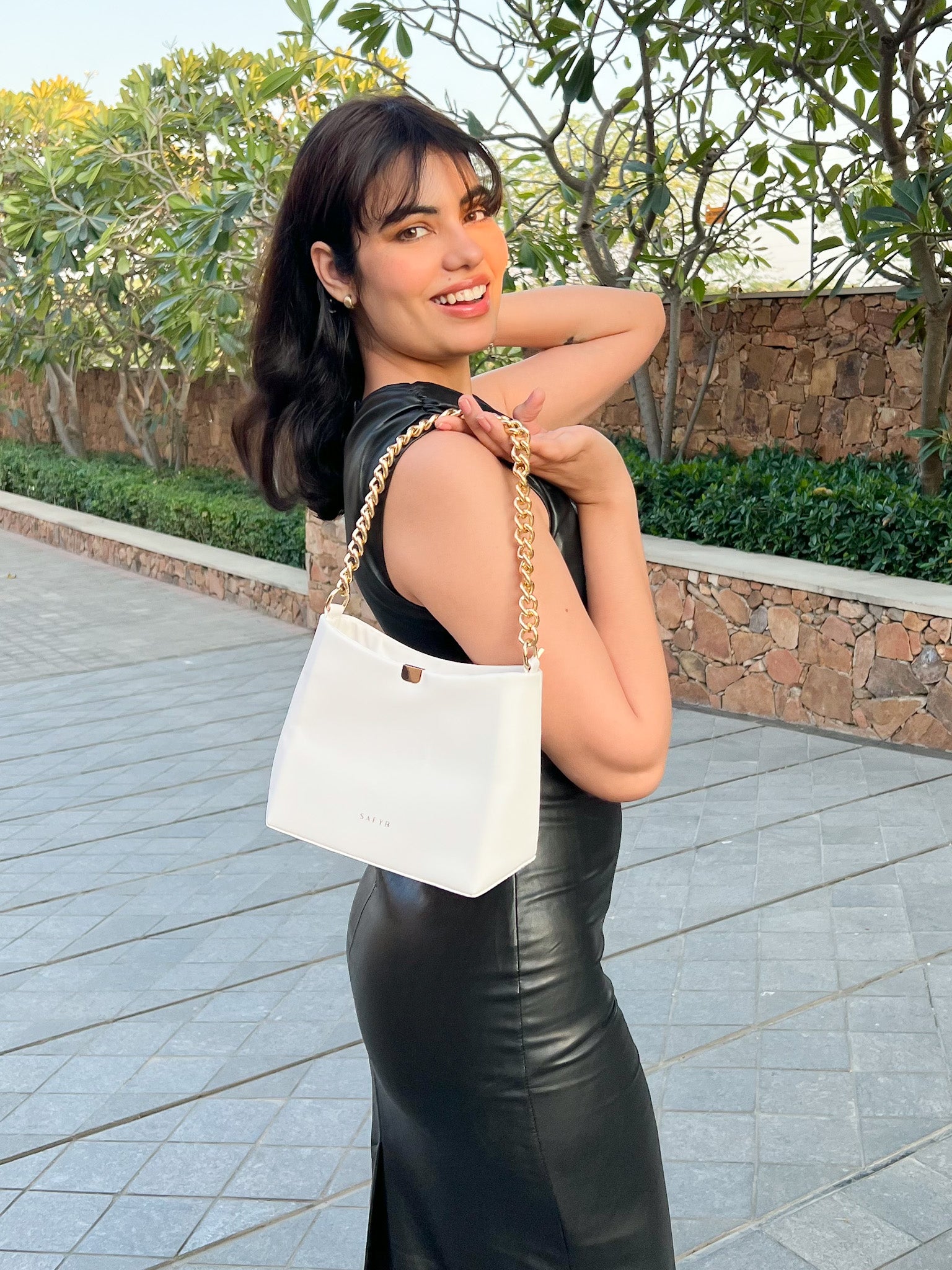 This geometrically-inspired companion features an adjustable shoulder strap and chain handle, allowing it to be worn as a shoulder or crossbody bag.